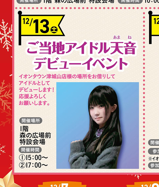デビュー日が決まりました! イベント情報 2025.12.012025.12.05 日付:2025/12/13場所:イオンタウン津城山時間:15:00~ 17:00~ 2回公演 みなさん、天音を応援しに来てください!